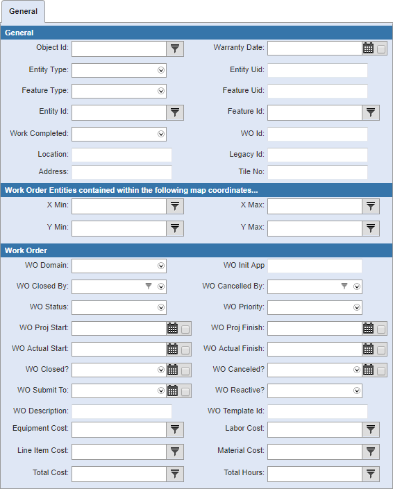 The work order entity search allows the user to search for an entity to see if it is associated to a work order. See Perform a Like Search, Perform a Quick Search, Perform a Wildcard Search, and Search Within a Numeric Range for more information on searching.
